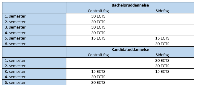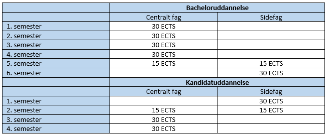 Hvis din uddannelse skal studietidsforlænges, bliver den forlænget med et semester på kandidatuddannelsen. Du vil dermed komme til at læse dit sidefag på 5. og 6. semester af bacheloruddannelsen og på 1., 2. og 3. semester af kandidatuddannelsen. Sidefaget udgør 45 ECTS på bacheloruddannelsen og 75 ECTS på kandidatuddannelsen.