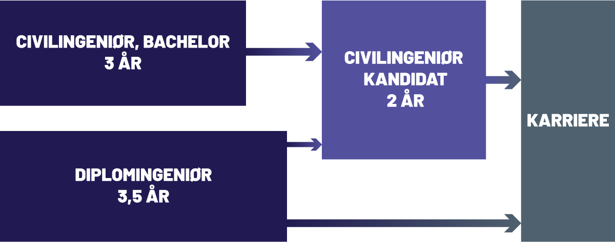 Du kan vælge imellem at uddanne dig civilingeniør eller diplomingeniør. Civilingeniøruddannelsen består af en 3-årig bachelorudddannelse og efter efterfølgende en 2-årig kandidatuddannelse. Diplomingeniøruddannelse er på 3½ år, hvorefter du kan gå direkte ud i job.